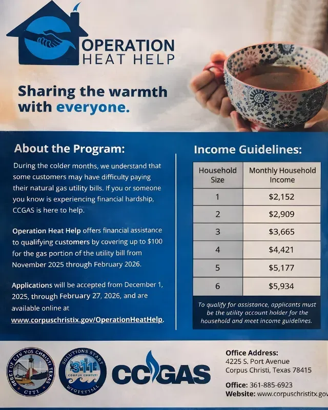 Operation Heat Help provides financial assistance to qualifying customers by covering up to $100 for the gas portion of their utility bill from November 2025 through February 2026. To be eligible, applicants must be the utility account holder and meet specific monthly household income guidelines, such as a limit of $2,152 for a single-person household or $4,421 for a family of four. While this particular program focuses strictly on natural gas bills, applications are accepted from December 1, 2025, through February 27, 2026, and can be submitted online at the City of Corpus Christi website.